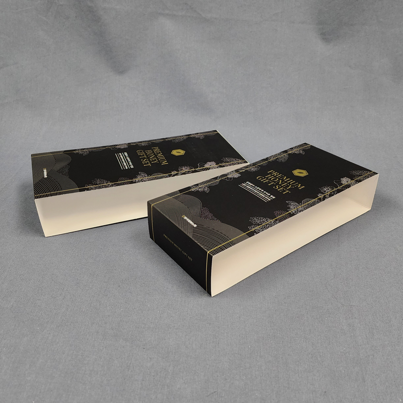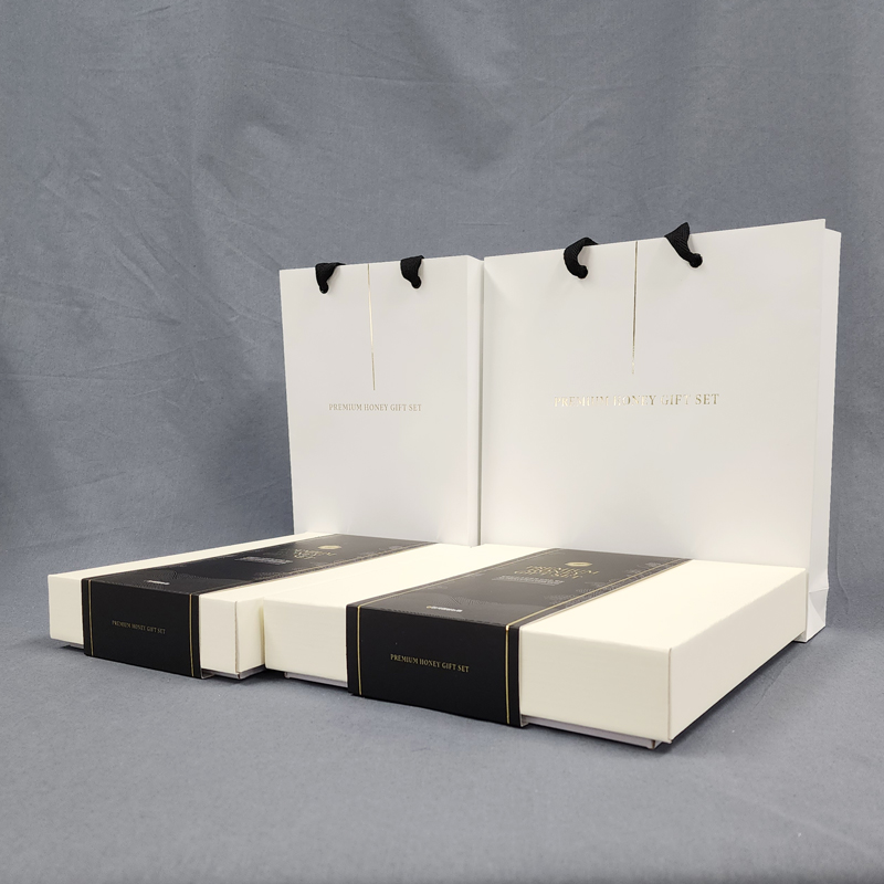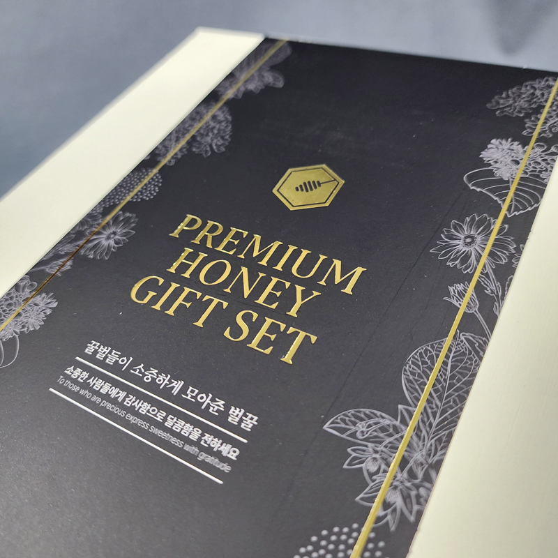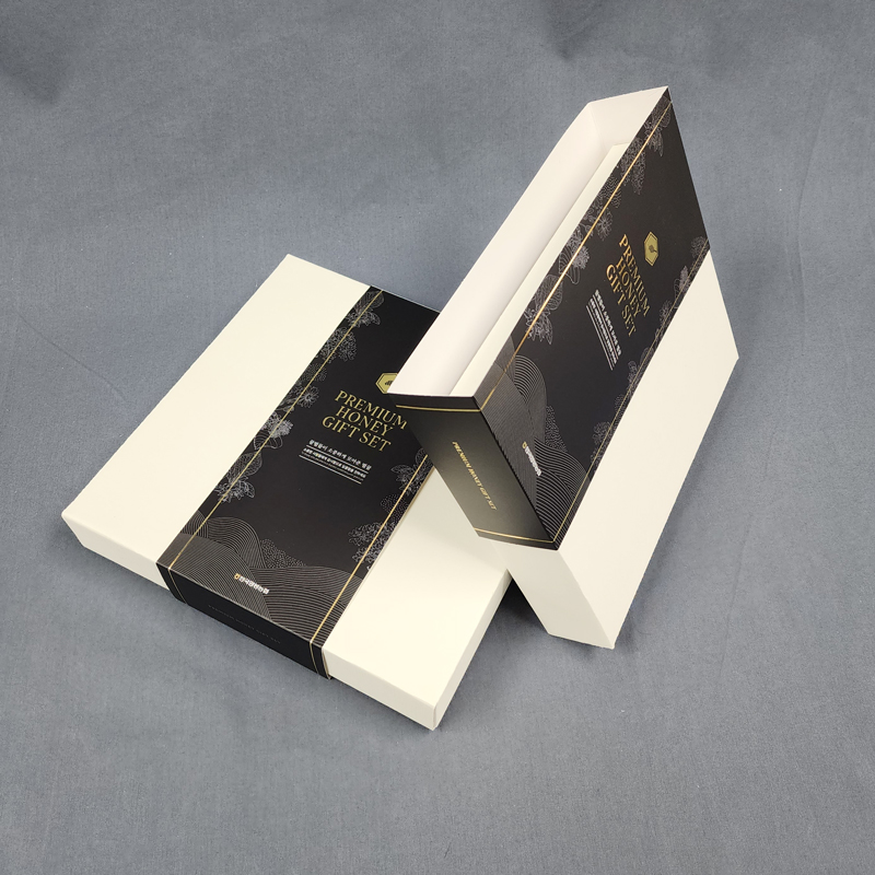 저희가 얼마 전 제작해 납품한 꿀 선물세트 박스형태 또한 귀하신 계층입니다. 상하짝 박스에 띠지로 마감하고, 쇼핑백이란 ‘집사’까지 거느리고 있으니.. 선물패키지에 어울리는 최상위 귀족층임이 분명합니다.