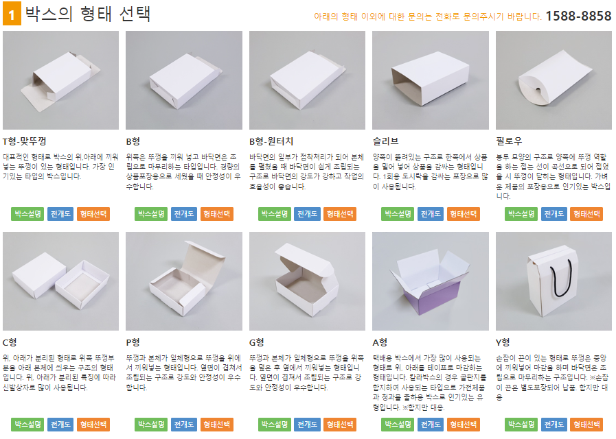 1 박스의 형태 선택 아래의 형태 이외에 대한 문의는 전화로 문의주시기 바랍니다. 1588-8858
